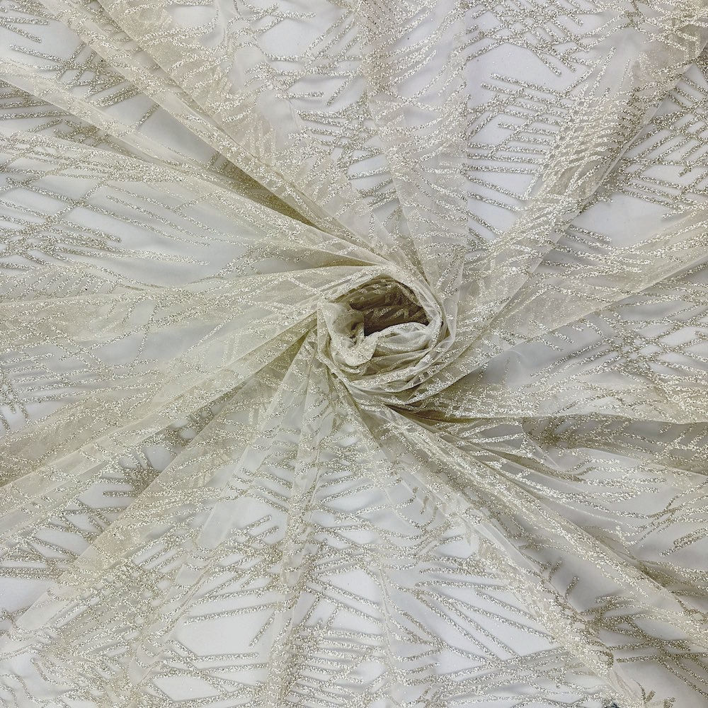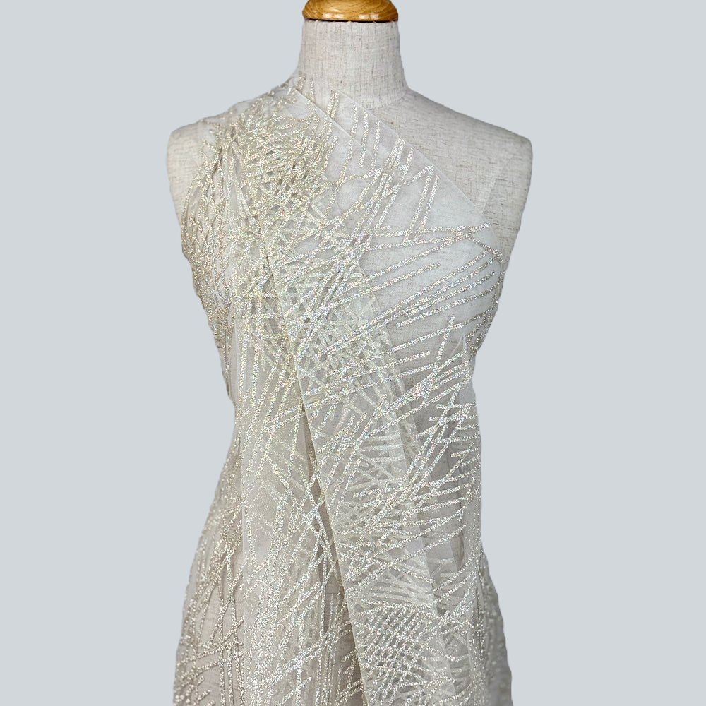This premium European tulle lavished with crusted mirror glitter glued to the fine mesh base in an abstract pattern creates a dynamic texture and contrast that shifts beautifully with movement and light.
