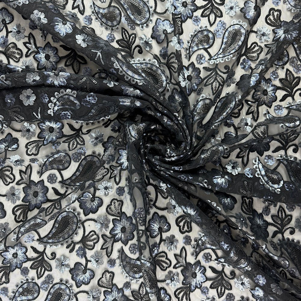 Classic paisley sequin & embroidery pattern in elegant colours on a polyester tulle create an understated special occasion offering.