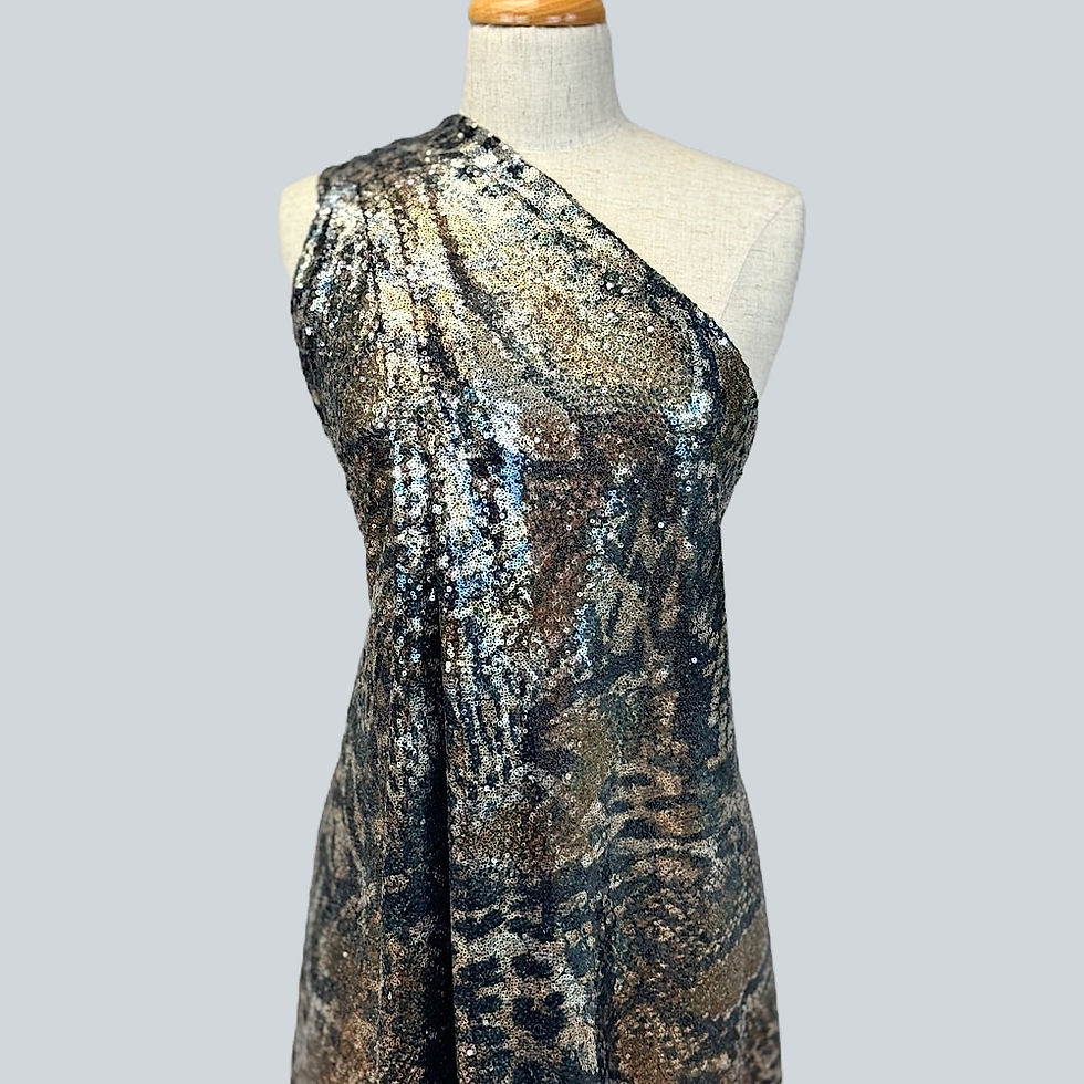Sparkling printed sequins on a poly tulle create a unique after 5 option. The tulle has some mechanical stretch for comfort and fit.