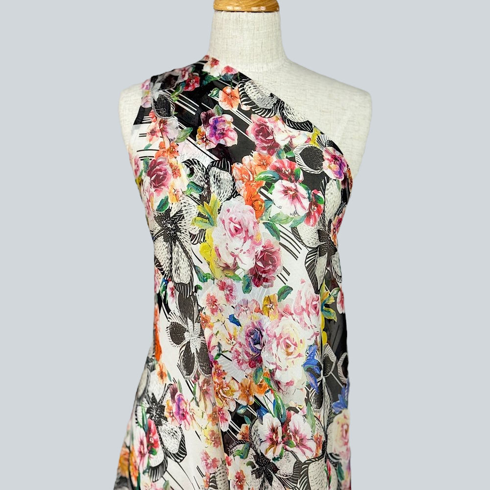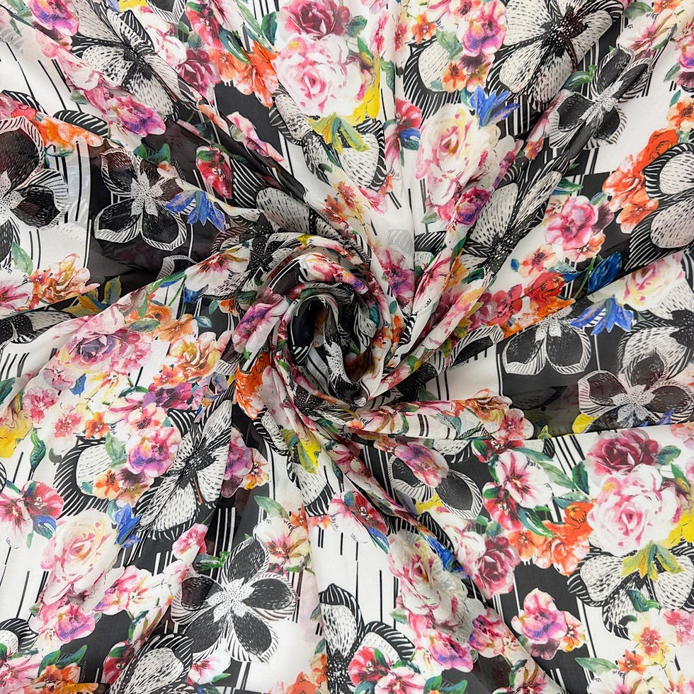 The digital print process ensures vivid colours, intricate detail, and lasting clarity, allowing every pattern to shine with sheer elegance. Ideal for blouses, dresses, overlays, scarves, and eveningwear, this fabric delivers a couture finish to every project.