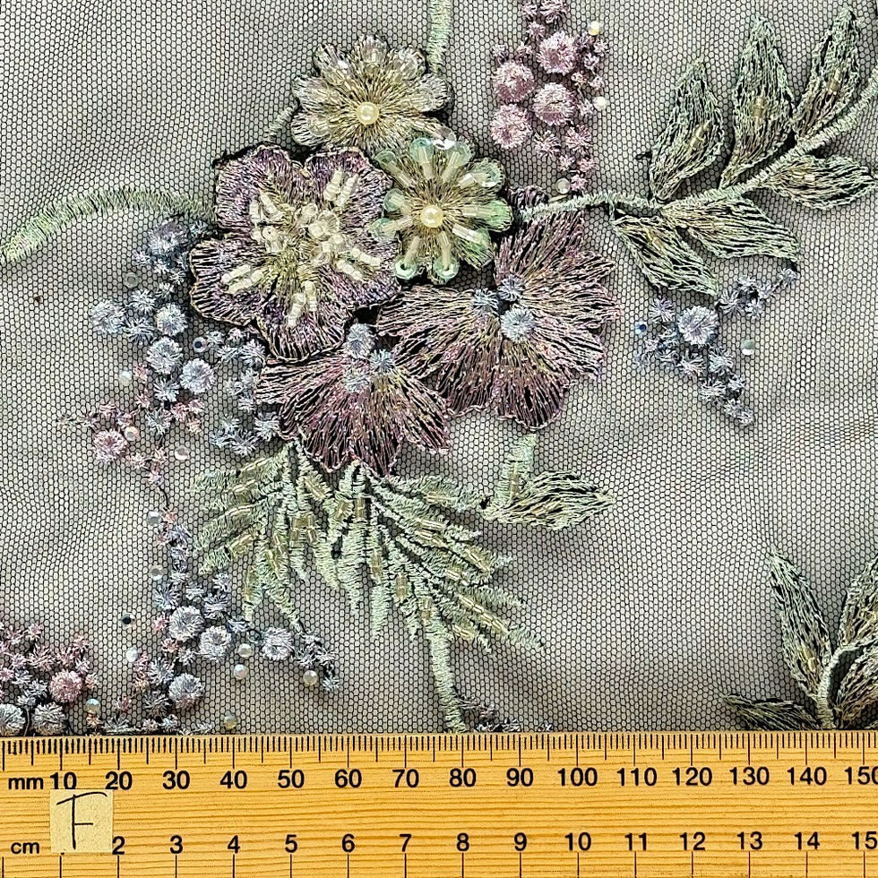 Delicate layered embroidery on black tulle create a 3 dimensional fabric. Adorned with sequin, bead and tonal applique diamante the result is a striking special occasion lace.