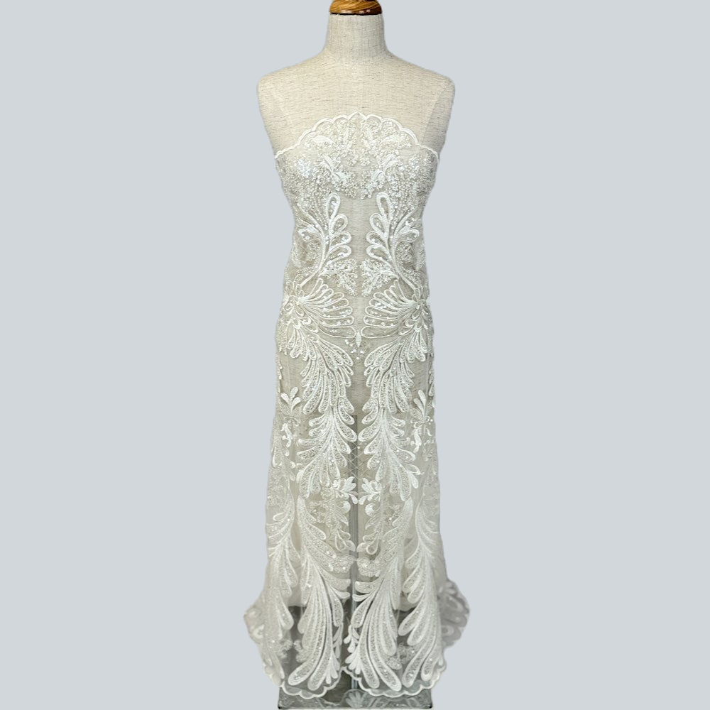 This unique styled bridal tulle features rich embroidery with hand stitched sequin & beads to form the motif. This design features a scalloped edge on both sides.