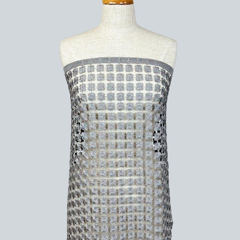 Elegant guipure lace in lattice pattern with delicate lash detail and lurex accents.