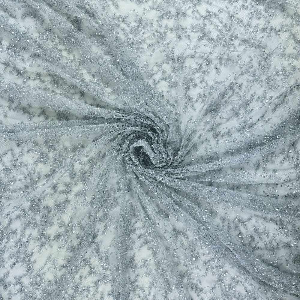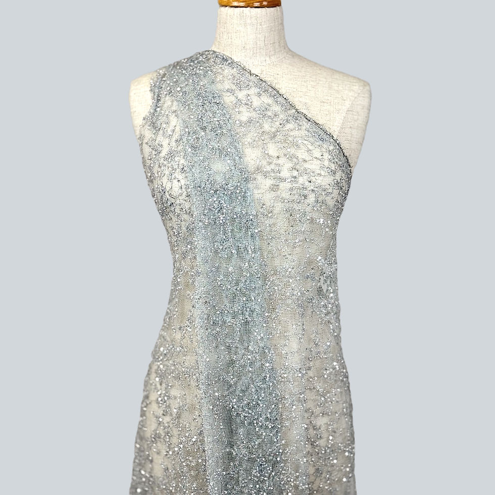 This luxurious couture lace features intricate hand-beading and sequin work with a delicate addition of lurex to create a lace that will add a touch of opulence and glamour to any garment. Perfect for high-end couture dresses, gowns, and special occasion wear.