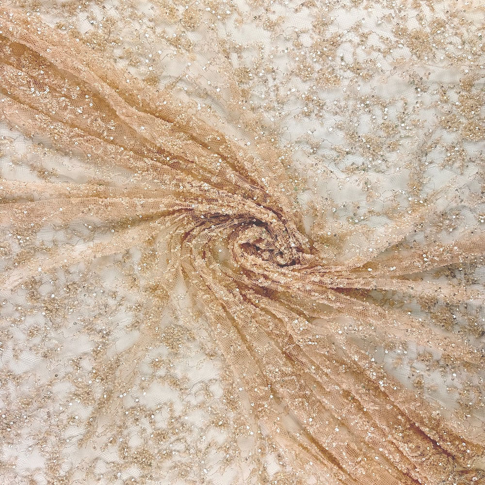 This luxurious couture lace features intricate hand-beading and sequin work with a delicate addition of lurex to create a lace that will add a touch of opulence and glamour to any garment. Perfect for high-end couture dresses, gowns, and special occasion wear.