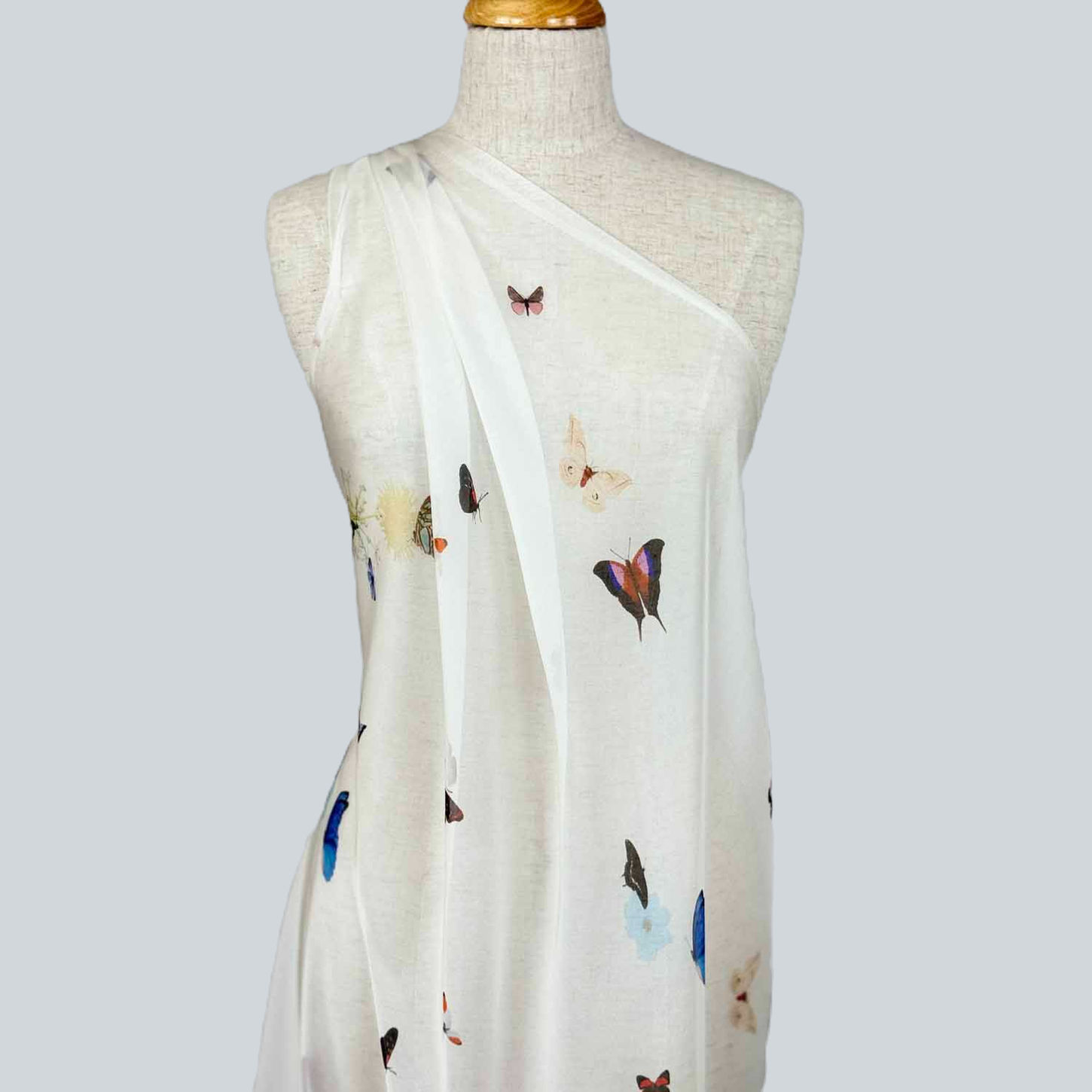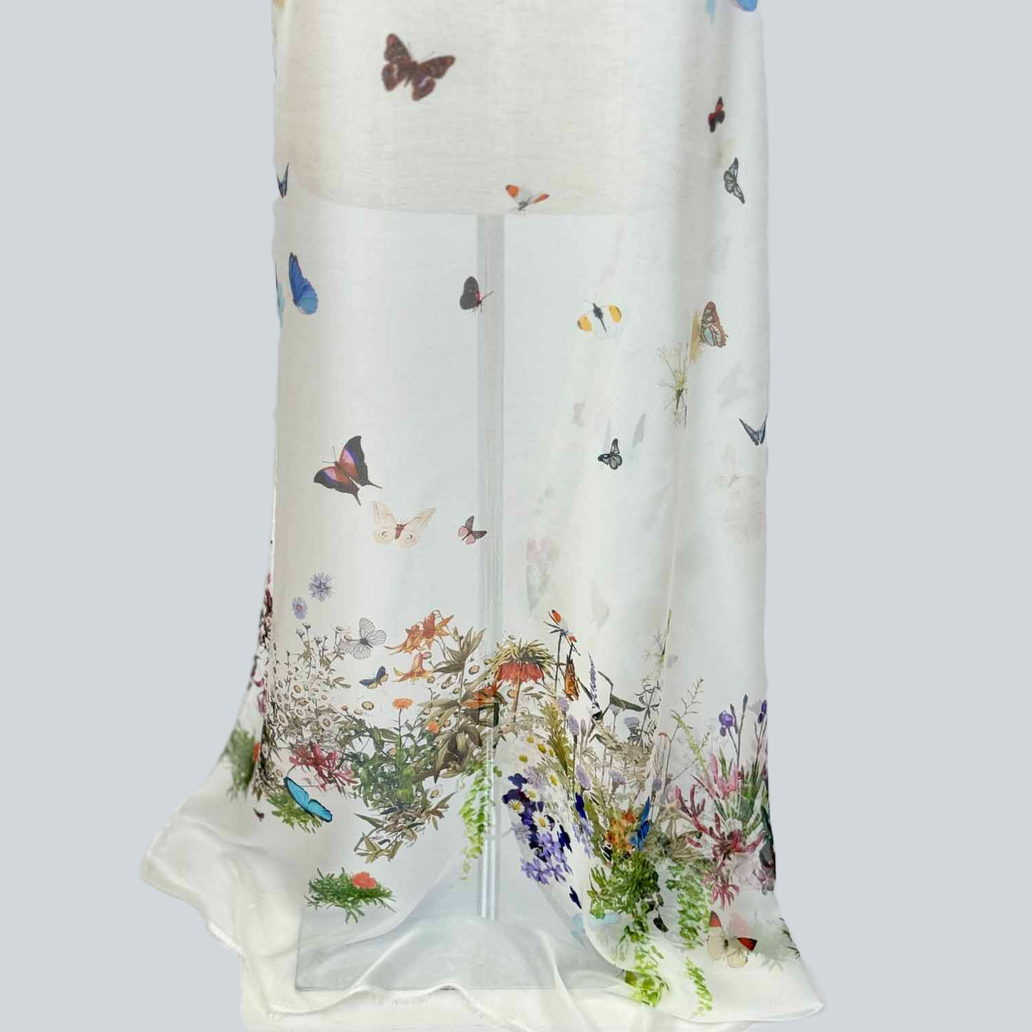 Digitally printed luxurious mulberry silk chiffon with the unmistakable feel and drape that only silk can offer. Not for use in tight fitting garments.