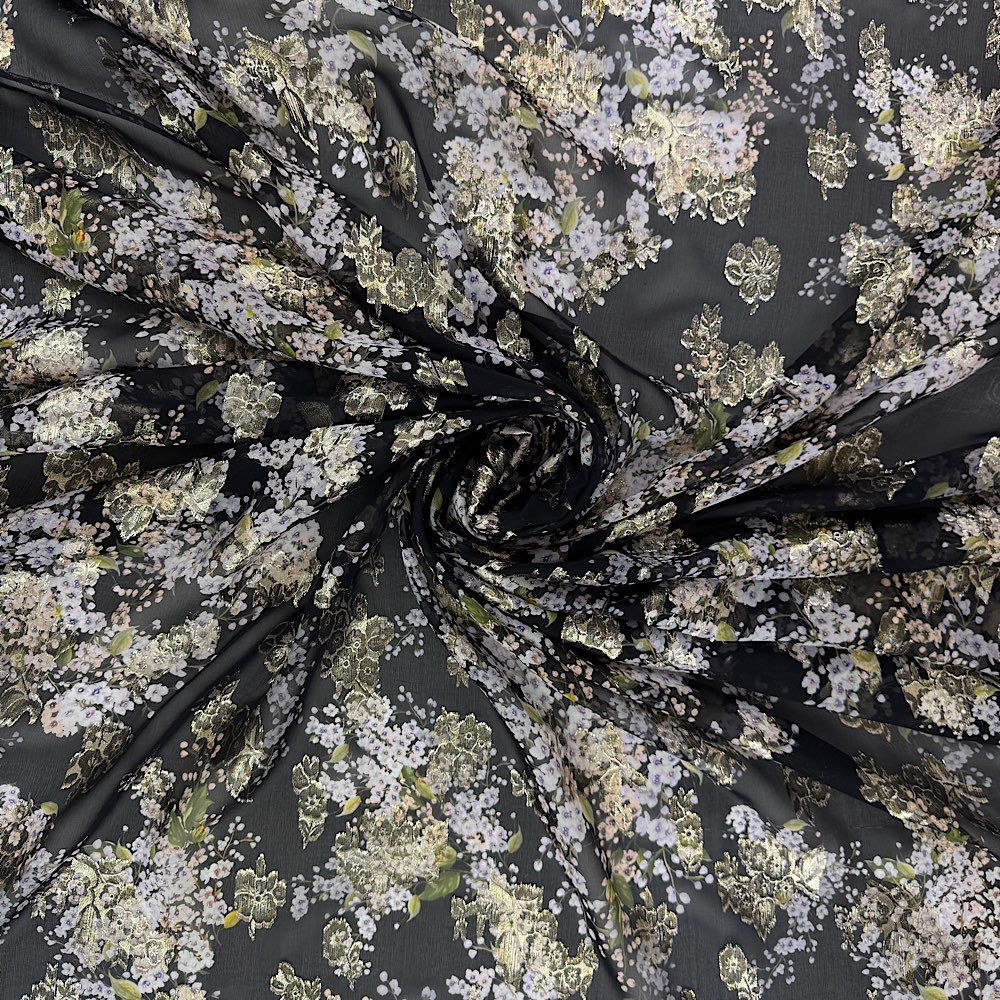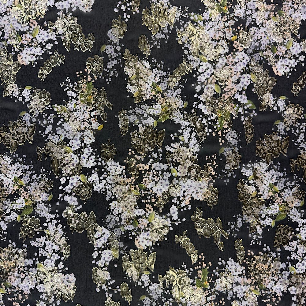 Intorducing Primavera; a luxurious Italian silk chiffon, exquisitely printed with a delicate spring floral design. This lightweight, ethereal fabric is enhanced by a woven gold lurex jacquard, carefully clipped to create a breathtaking "Fil Coupé" effect. The intricate texture catches the light beautifully, adding a touch of refined glamour to any garment.