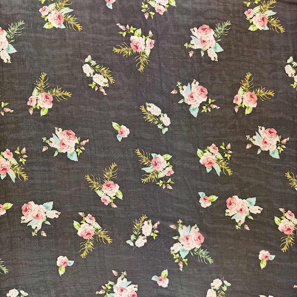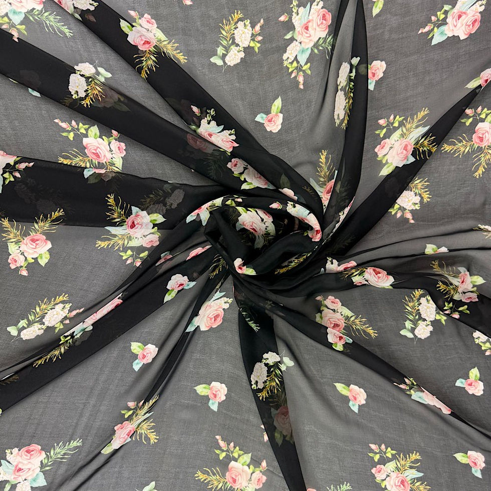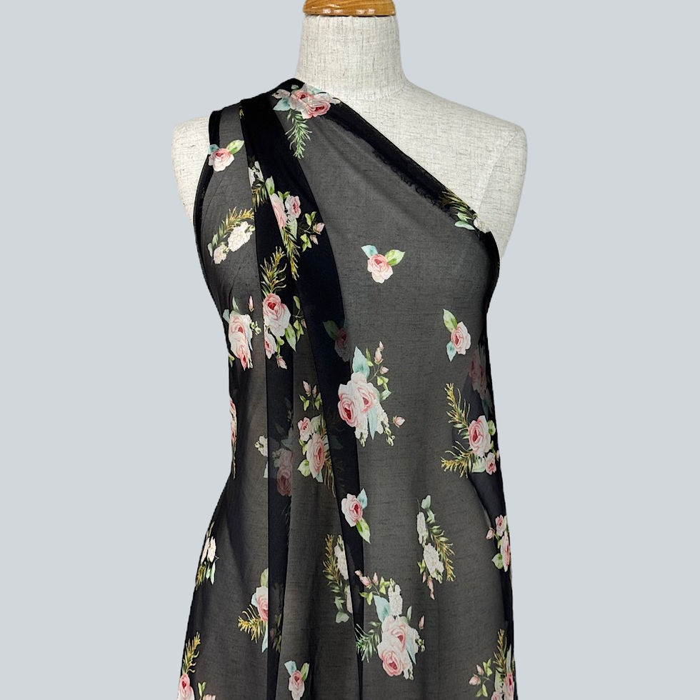 Digitally printed luxurious mulberry silk chiffon with the unmistakable feel and drape that only silk can offer. Not for use in tight fitting garments.