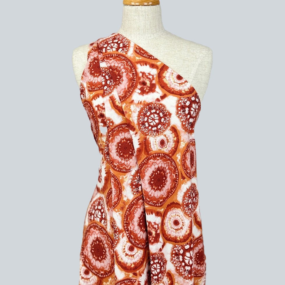 Lightweight printed Rayon / Cotton blend provides a breathable and comfortable feel with versitility. At 85gsm this fabric offers multiple end uses including lined dress, shirt, blouse, top, etc