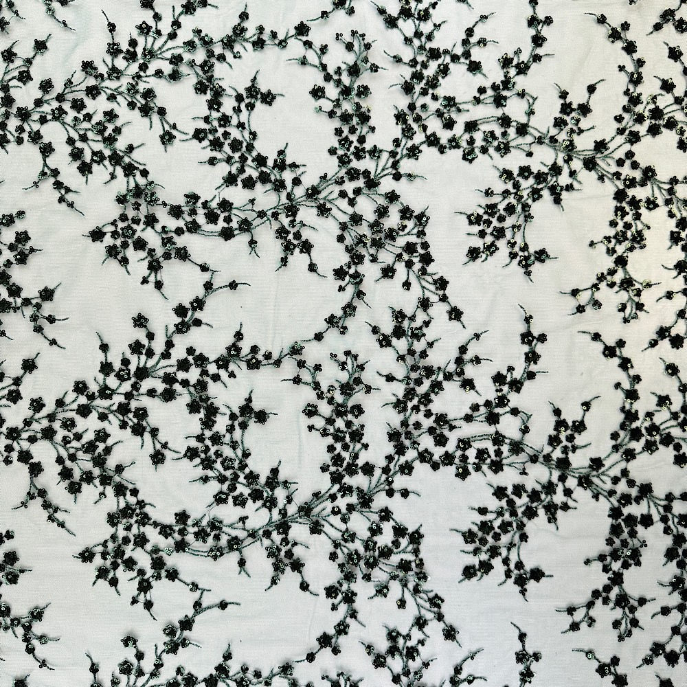 Tonal sequin and embroidery on matching tulle with lurex accents make this a classy option for an evening wear make.